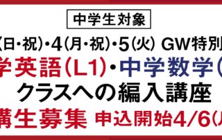5月3日(日・祝)、4日(月・祝)、5日(火・祝)の3日間で中学数学・英語のGW特別講座を開講いたします。 ...